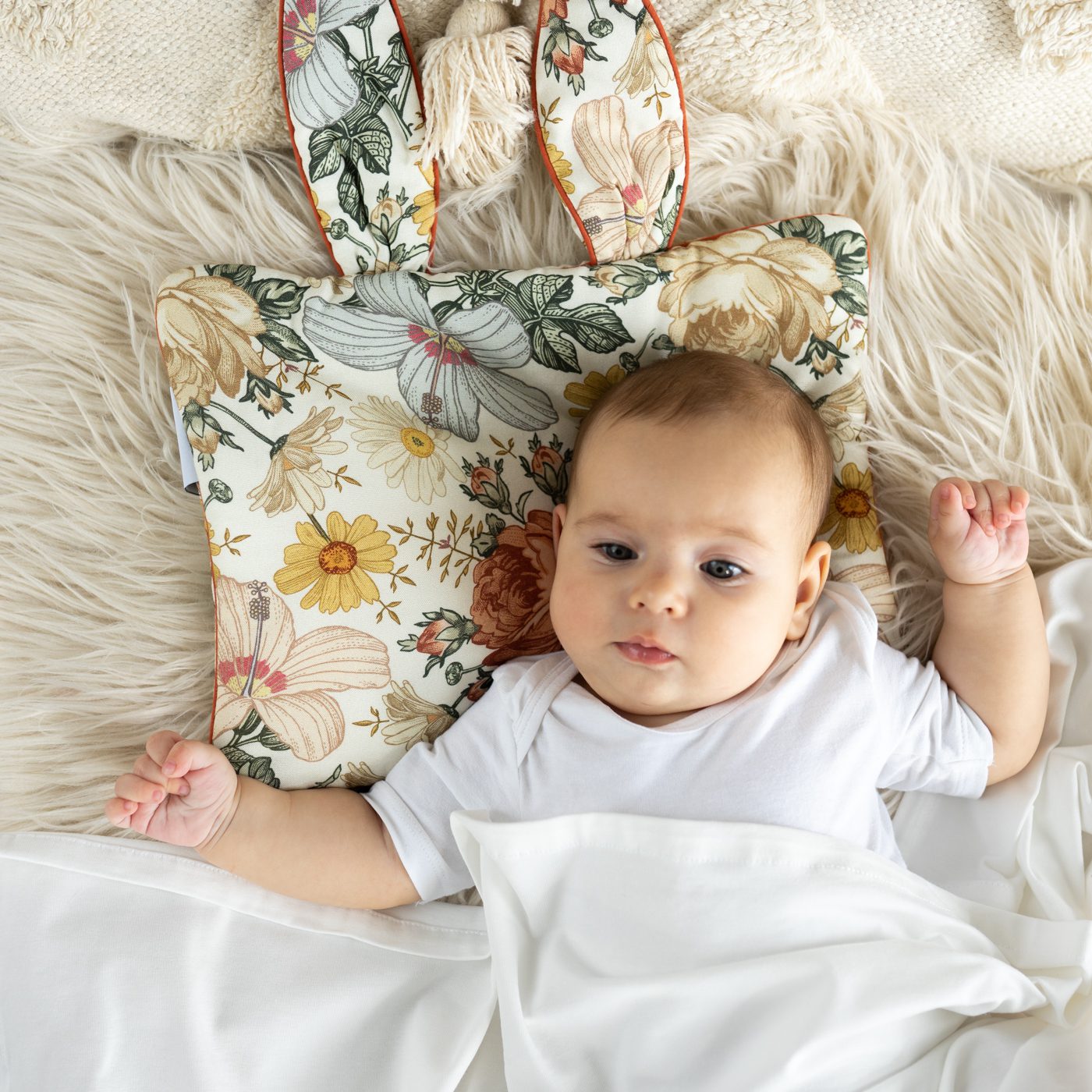 Poduszka uszatka została uszyta z wysokiej jakości bawełny satynowej. Ozdobiona uroczą wypustką.
