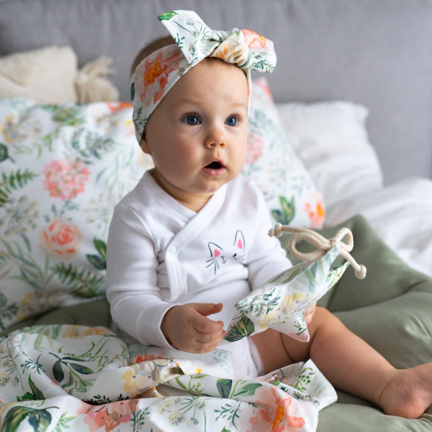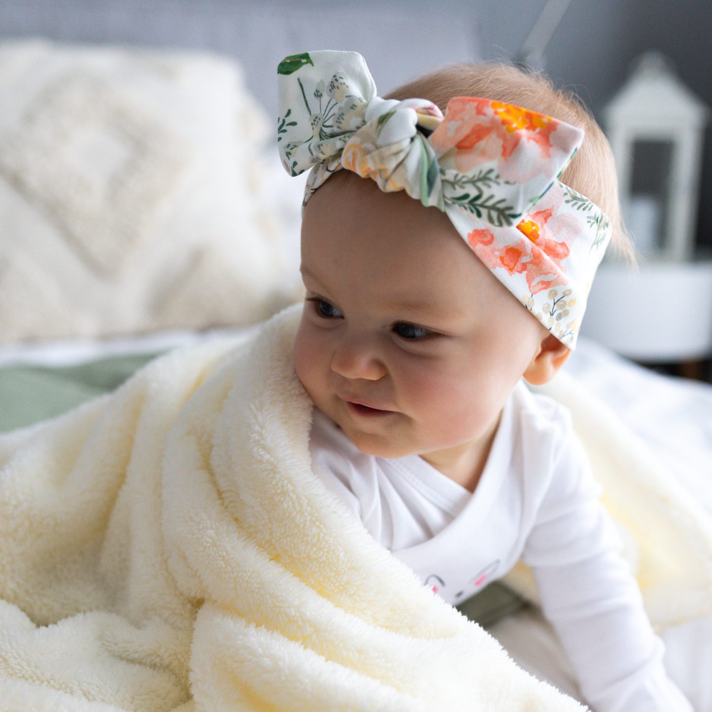 Dodatek elastanu powoduje, że opaska nie uciska główki i „rośnie” wraz z dzieckiem.