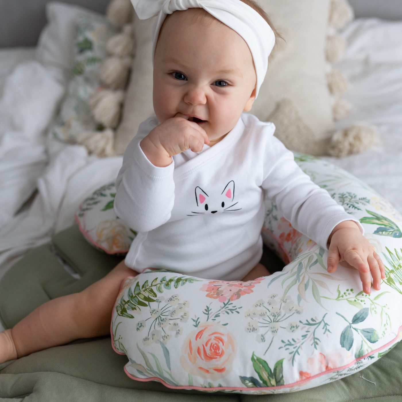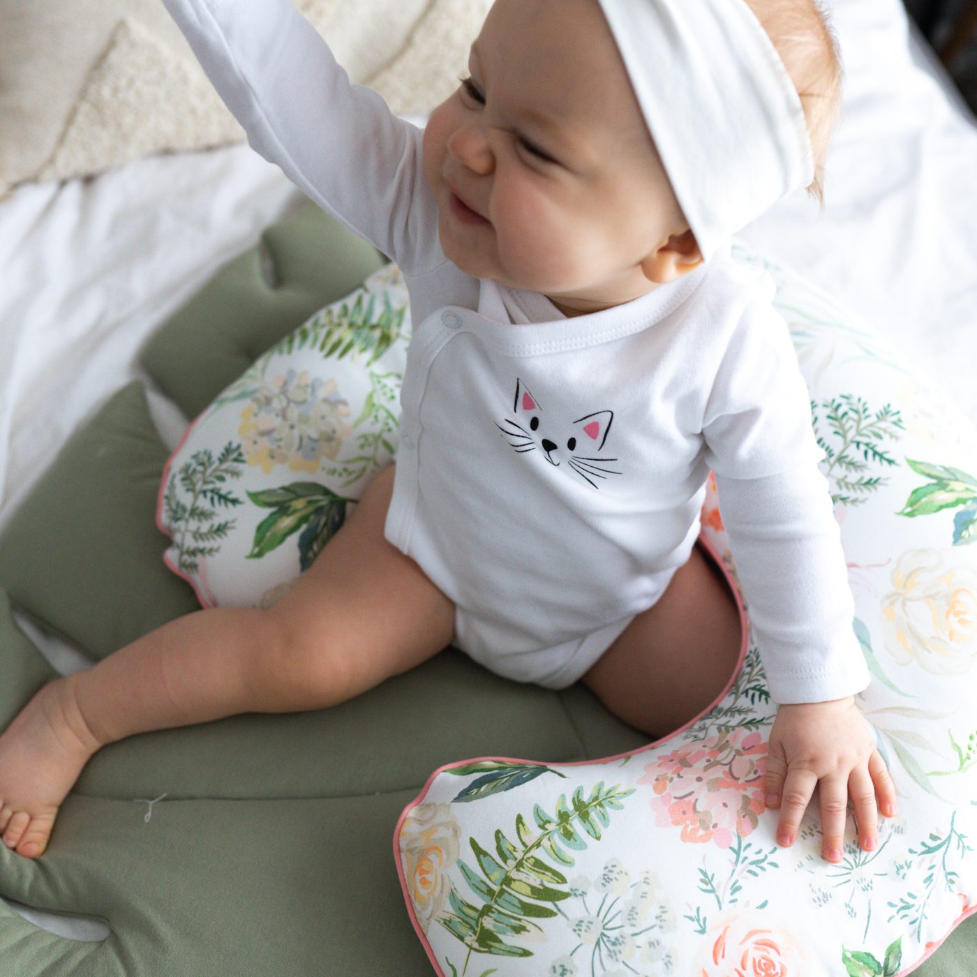 Poduszkę można wykorzystać w kolejnym etapie rozwoju dziecka, jako podporę podczas nauki siadania.