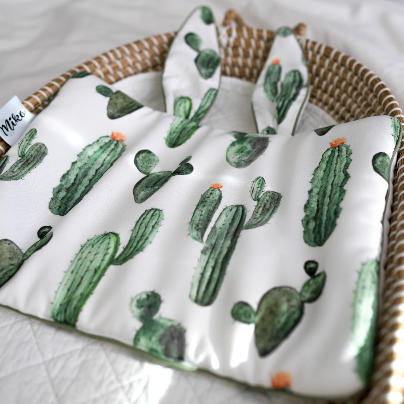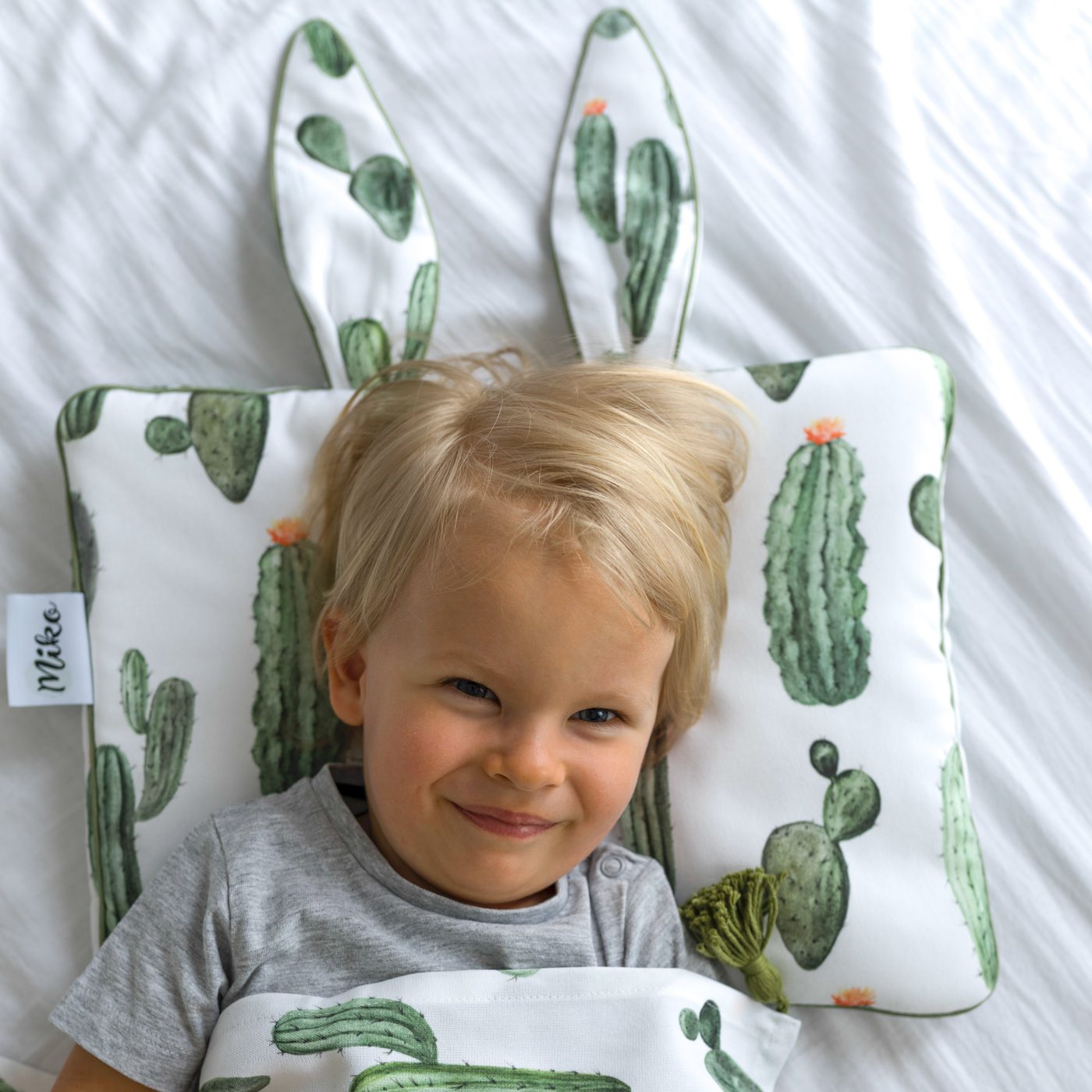Poduszka uszatka została uszyta z wysokiej jakości bawełny satynowej. Ozdobiona uroczą wypustką.