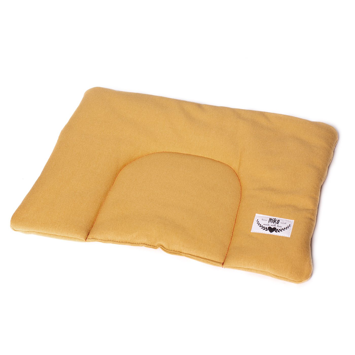 Poduszka wykonana w całości z dzianiny. W środku wszyta jest podwójna warstwa włókniny, dlatego poduszeczka jest płaska i nadaje się od pierwszych dni życia dziecka.