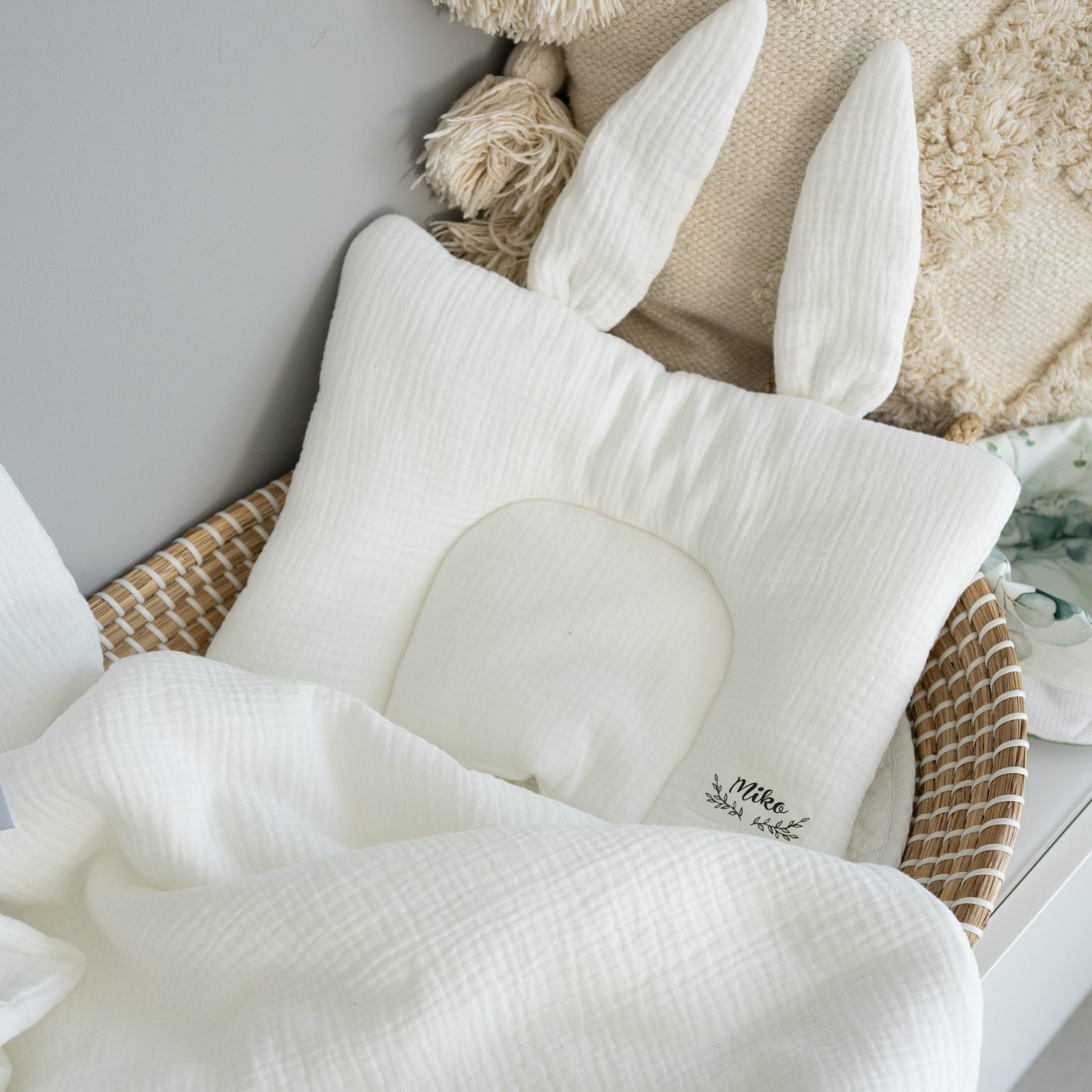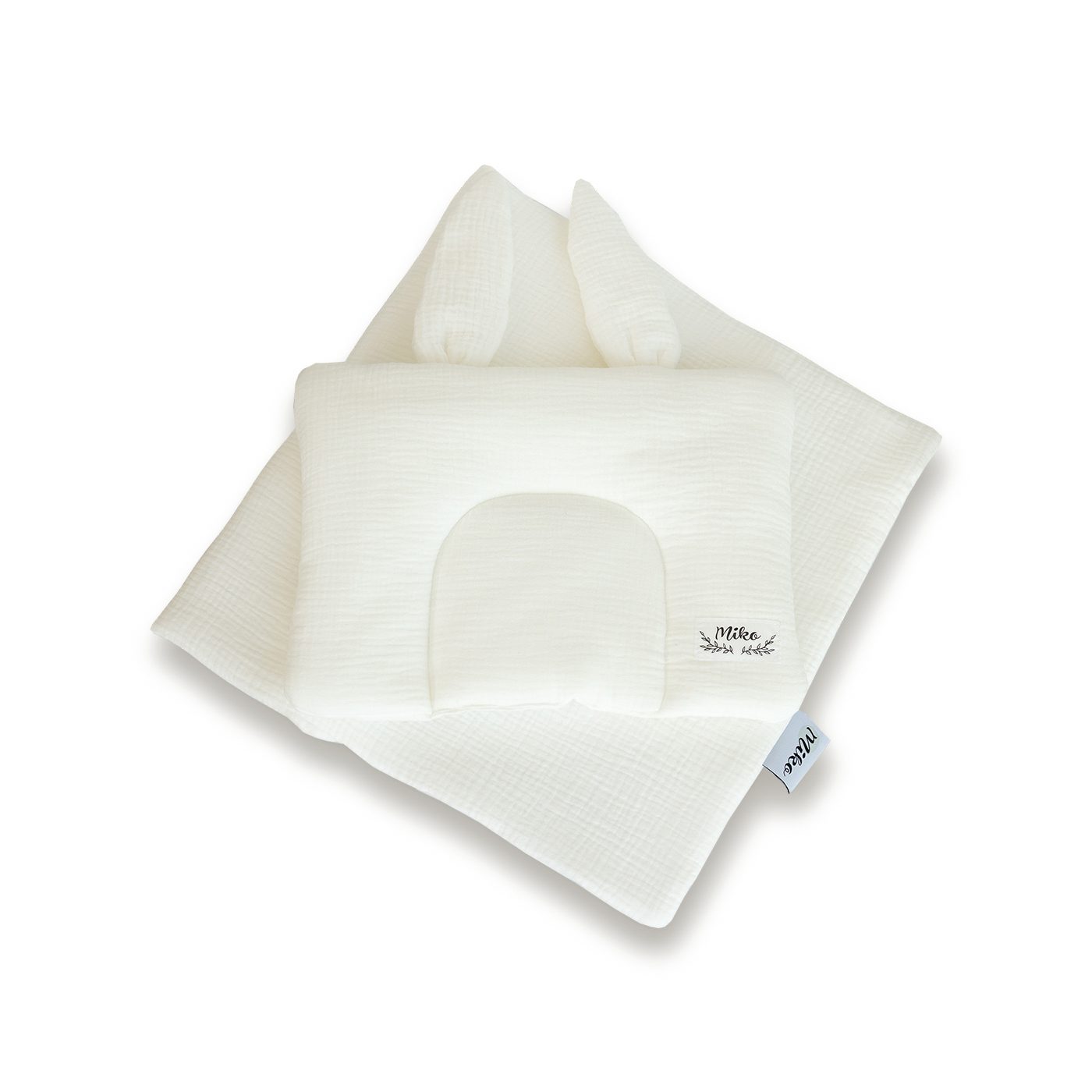 Poduszeczka z uszkami jest płaska, idealna od pierwszych chwil życia dziecka.